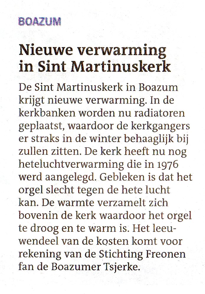Nieuwe verwarming, artikel Leeuwarder Courant 30-01-2016 admin 3 februari 2016 3 juni 2025 Reacties uitgeschakeld voor Nieuwe verwarming, artikel Leeuwarder Courant 30-01-2016