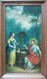 Toen er in 1870 in Boazum een nieuwe pastorie werd gebouwd bleef het schoorsteenstuk gespaard. Na de voltooiing van de kerkrestauratie in 1948 kreeg het schilderij (rechts iets ingekort en voorts voorzien van een nieuwe eiken lijst) een plaats in de nieuw ingerichte consistoriekamer in de voorkerk. In 1987 werd het schoongemaakt en op hout geplakt. Het schilderij (doek, 59 x 33 cm.) vertoont rechts Jezus met een aureool. Hij zit bij een put en tegenover hem staat met uitgestrekte hand de Samaritaanse vrouw met wie hij een gesprek voert (Joh. 4:7). Het tafereel is ongetwijfeld naar een prent vervaardigd, maar een exact gelijkend voorbeeld is vooralsnog niet gevonden. Een prent van Jan Luyken (1649–1712) komt er het dichtst bij. De personen en hun kleding zijn geschilderd als die op het behangsel van de Maaltijd te Emmaus.
